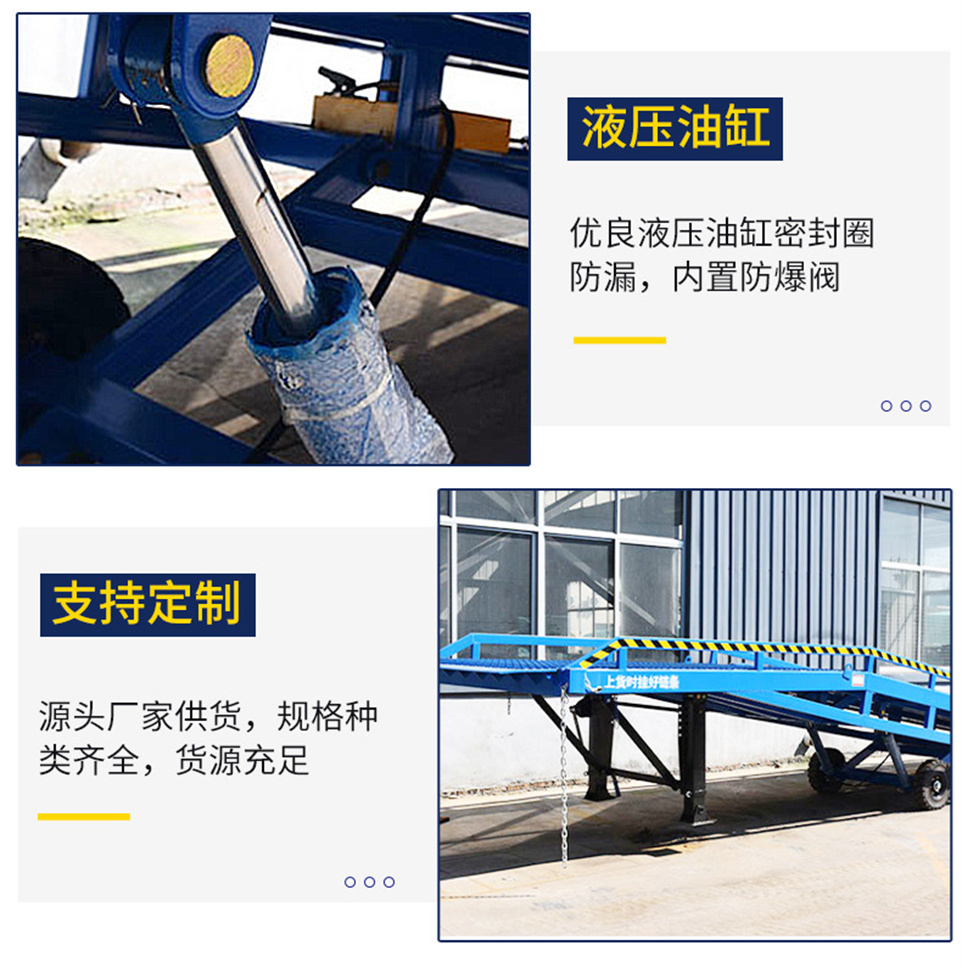 采(cǎi)用手压(yā)液压泵作动力,无需外接动力电(diàn)源即可轻松实现登车桥高度的调节