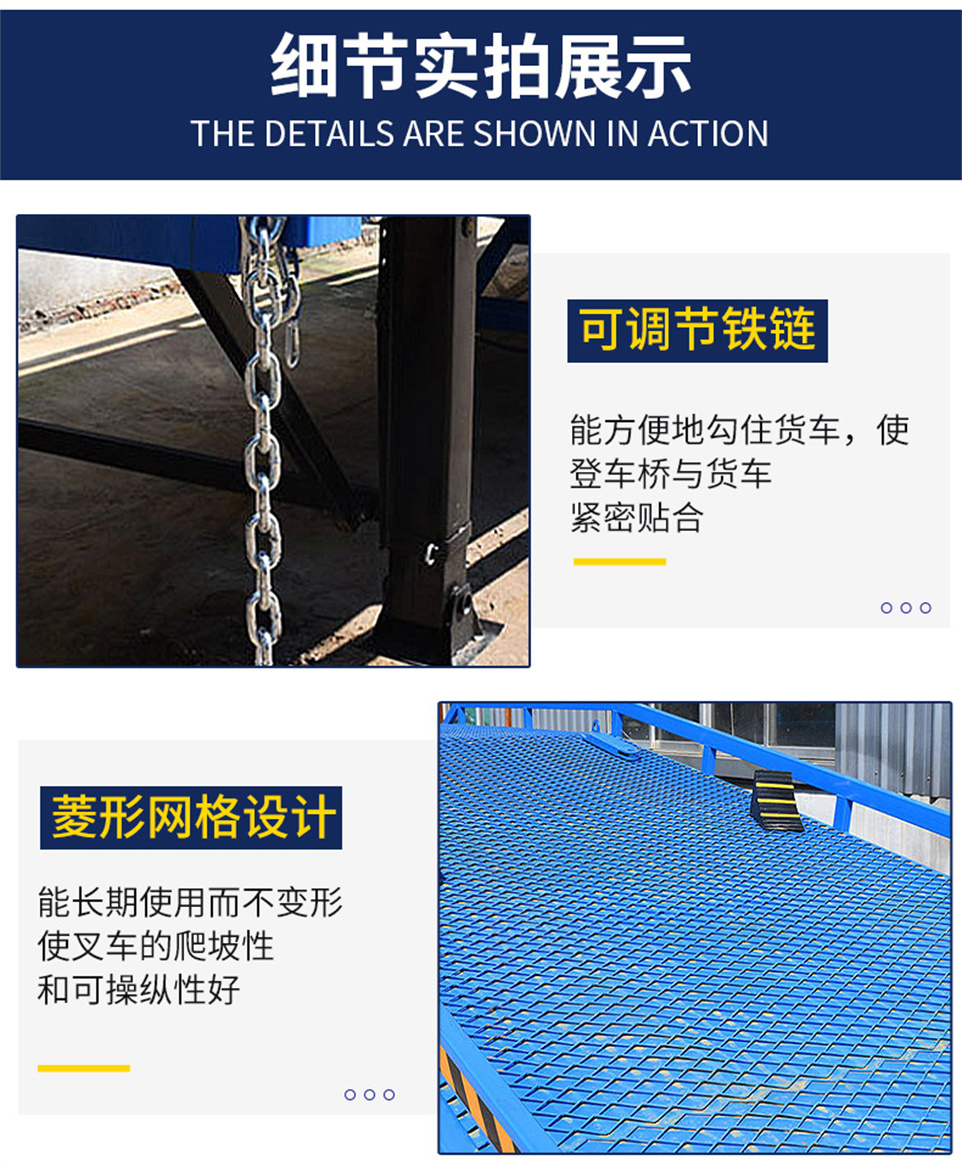 可调节长度的索链能方便地钩住货车(chē),使移动式登车桥与货车始终紧密贴合。