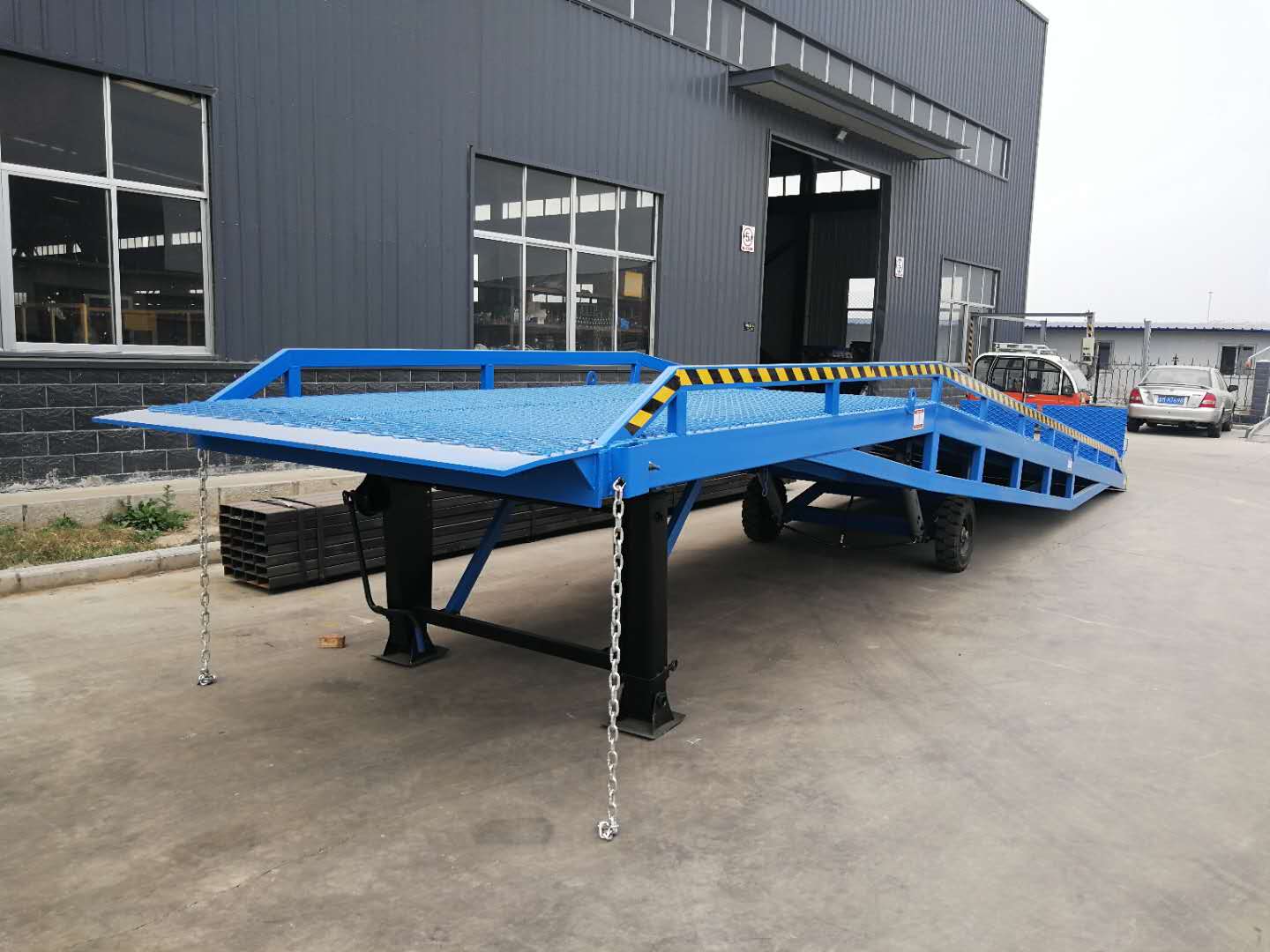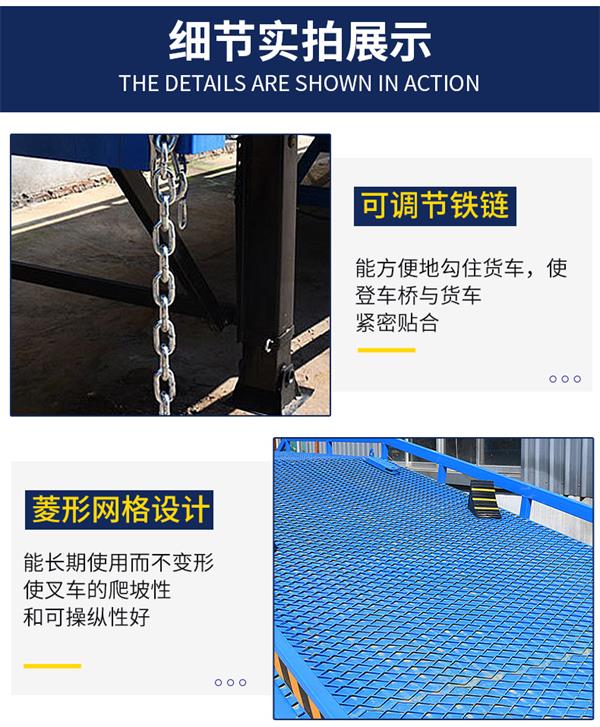 可調節長度的(de)索鏈能方便地鉤住貨車,使移動式登車橋與貨車(chē)始終緊密貼合。